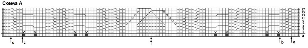 Ряд а относится к предпоследнему ряду планки из резинки. В изнаночных рядах петли вязать по рисунку. Начинать с петель перед стрелкой а, повторять 5 (6) 7 раз 4 п. раппорта между стрелками а и b, выполнять 82 п. между стрелками b и с 1 раз, повторять 5 (6) 7 раз 4 п. раппорта между стрелками c и d, заканчивать петлями после стрелки d. Двойной стрелкой обозначена середина. В 1-м ряду узора прибавить для выравнивания узоров 8 п., как обозначено = 90 п. между стрелками b и с. Выполнить с 1-го по18-й ряды 1 раз, далее повторять с 3-го по18-й ряды.