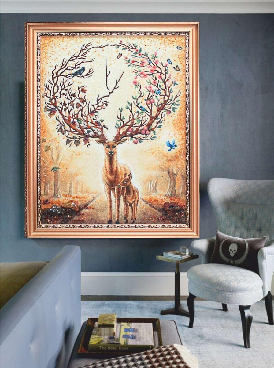 картина из янтаря “олень” в интерьере