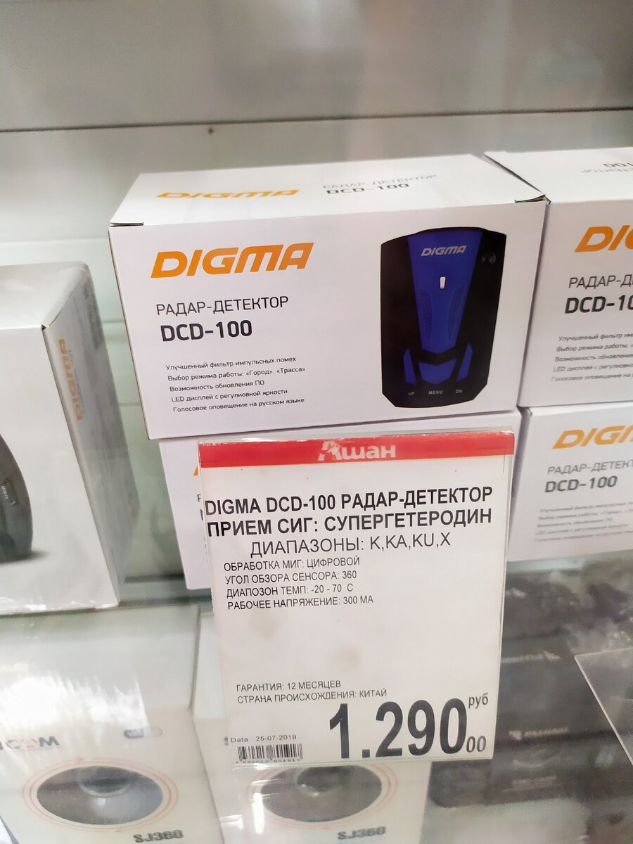 Современный и стильный радар-детектор DIGMA DCD-100 с углом обзора 360 градусов, что немаловажно. Символьный дисплей и два режима настройки. Есть голосовое оповещение на русском языке. Крепится на присосках или просто на коврике. Цена 1290 рублей.