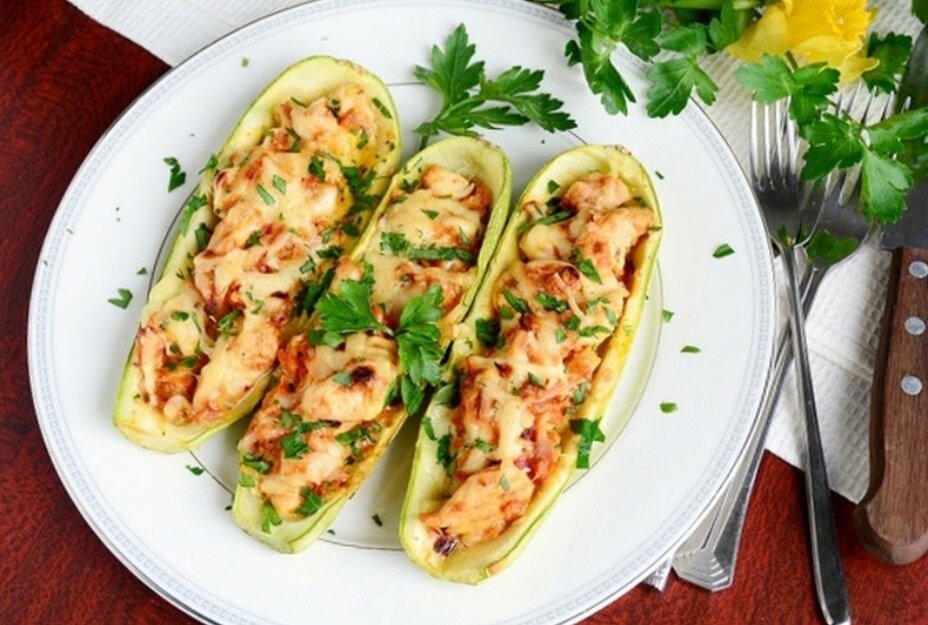 * Кабачок – половина (1 средний на 2 порции) * Куриное филе – 150 г (300 г на 2 порции) * Лук – 30 г (60 г на 2 порции) * Шампиньоны – 50 г (100 г на 2 порции) * Соль, перец, зелень - по вкусу * Твердый сыр- 20 г (40 г на 2 порции) Кабачки разрезать на 2 части вдоль, удалить семена. Филе измельчить до фарша, добавить измельченный лук. Грибы отдельно приготовить (порезать, потушить в сковородке, добавив немного воды 5-10 мин). Смешать грибы и фарш, все посолить, добавить зелень. Выпекать в разогретой духовке при 180-200 градусах 25 минут. За 5 мин до готовности посыпать натертым сыром.