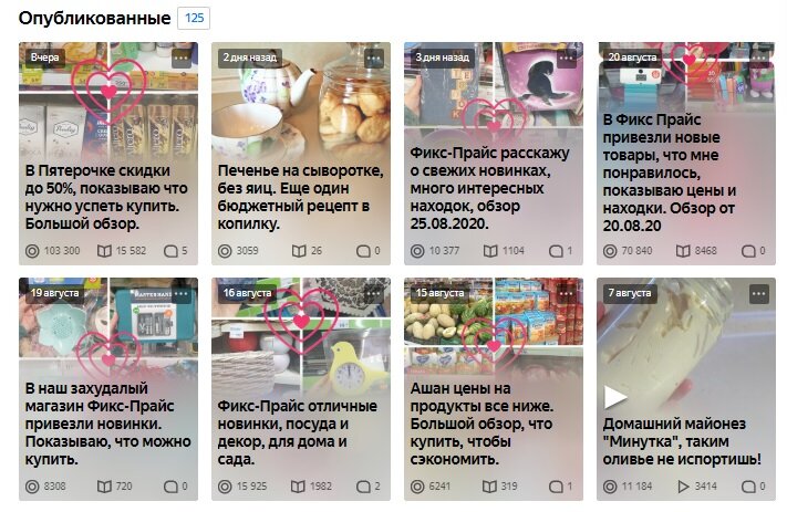 Большая часть моих статей это обзоры магазинов ИКЕА, АШАН, ФИКС-ПРАЙС. Благодаря им я вышла на монетизацию, т.к. изначально у канала была совсем другая тематика. Иногда на канале я делюсь простыми рецептами домашней кухни, но как правило у них совсем мало показов и дочитываний. Конкурировать с кулинарными каналами достаточно сложно.