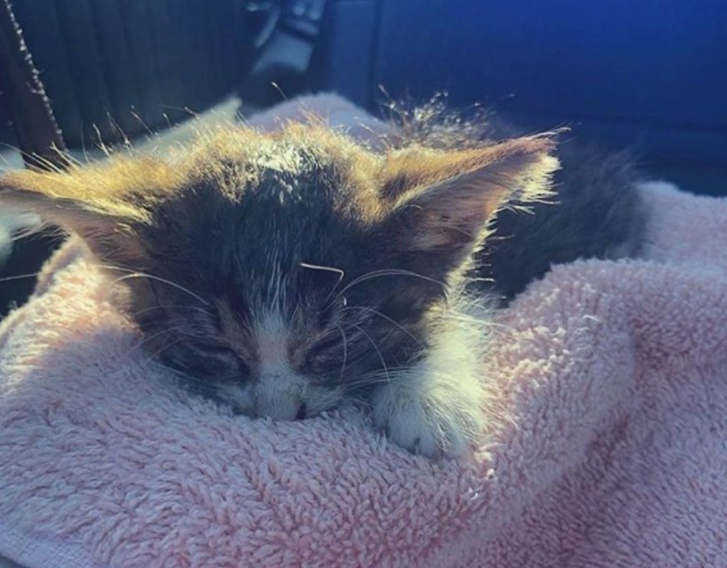 Пара, проезжая на своем автомобиле мимо поля, неподалеку от города, заметила маленького котенка, который сидел, прижавшись у края дороги. Она была очень напугана. Ребята остановились, чтобы помочь котенку. Девушка по имени Катерина со своим парнем проезжали мимо поля неподалеку от города и вдруг увидели, что у дороги сидит крошечная кошечка. Девушка рассказала: "Мы остановились и я вышла из машины. Котенок без промедления побежал мне навстречу». Маленькая крошка стала жалобно пищать и проситься на руки – Катерина не смогла оставить ее одну и она взяла маленького котенка с собой. В дороге кошечка сразу уснула, уткнув свой носик в руку своей спасительницы. Молодые люди котенку сразу дали имя - они назвали ее Филда и отвезли ее к ветеринару, который сразу определили ее возраст. Котенку оказалось примерно 1,5 месяца. У нее ветеринар обнаружил недовес, паразитов и ушную инфекцию. Он назначил ей необходимые лекарства, а уже дома Катерина принялась лечить свою подопечную. Понадобилась не од