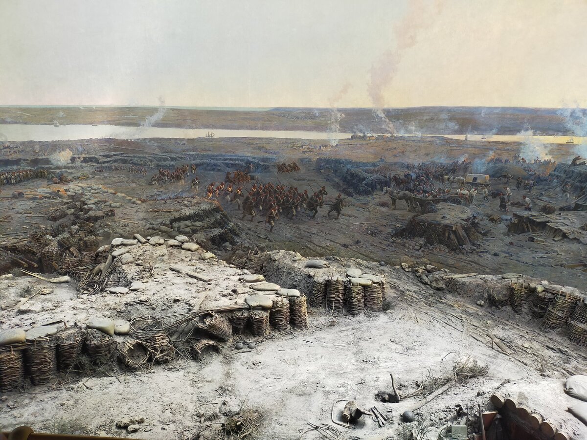 Во время Крымской войны на Россию навалились скопом Англия, Франция, Турция, итальянское королевство Сардиния, а в качестве “пятой колонны” выступил имам Шамиль. Оборона Севастополя длилась 349 дней. На круговой картине запечатлены события 18 июня 1855 года. Французский правитель Наполеон III выбрал эту дату для штурма, чтобы перекрыть славной победой напоминание о Ватерлоо. Но не вышло. Для французов день не особо удачный, видимо. Заодно и англичане попали под раздачу.