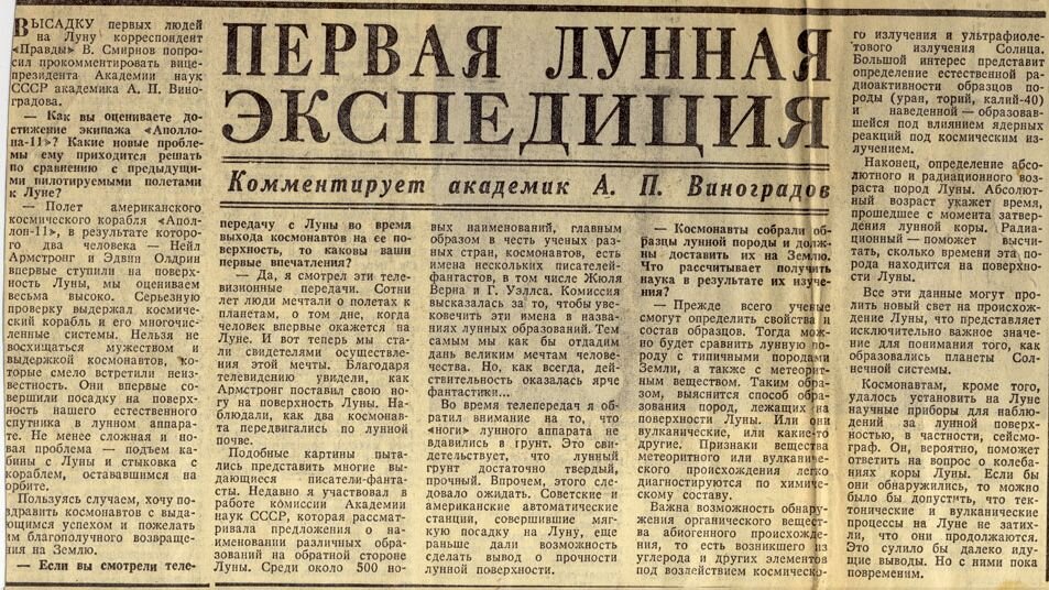 Существует мнение, что высадка американцев на Луну, не освещалась в Советской прессе. Но, на просторах интернета, я наткнулся на любопытную вырезку из газеты «Правда». В статье, академик, Александр Павлович Виноградов, комментирует первую высадку американцев на поверхность Луны. Высадку первых людей на Луну, корреспондент «Правды» В. Смирнов попросил прокомментировать вицепрезидента Академия наук СССР, академика А. П. Виноградова. Как вы оцениваете достижение экипажа "Аполлона-11"? Какие новые проблемы ему приходится решать по сравнению с предыдущими пилотируемыми полетами к Луне? Полет американского космического корабля "Аполлон-11", в результате которого два человека, Нейл Армстронг и Эдвин Олдрин, впервые ступили на поверхность Луны, мы оцениваем весьма высоко. Серьезную проверку выдержал космический корабль и его многочисленные системы. Нельзя не восхищаться мужеством и выдержкой космонавтов, которые смело встретили неизвестность. Они впервые совершили посадку на поверхность наше