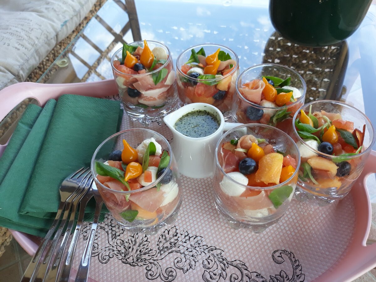 Потрясающий летний салат Капрезе не оставит никого равнодушным. Попробывав однажды, он станет одним из любимых ваших салатов. Ингредиенты: дыня, ветчина, сыр буратта, мелкие салатные листочки , немного мякоти томата плюс соус ( базилик,мед,сок лимона, бальзамический уксус, соль, перец), который добавлять непосредственно перед употреблением.