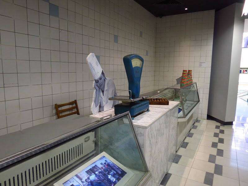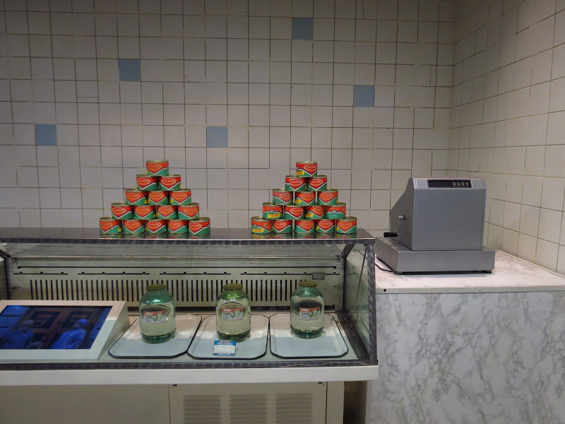 Удивительно, что такая крутая идея пришла в голову организаторам музея - сделать такой уголок, повторяющий обстановку постсоветского магазина (впрочем, как мы видели выше, это уже далеко не первый экспонат подобного рода).. На экране можно видеть драки и разные конфликты в очередях.