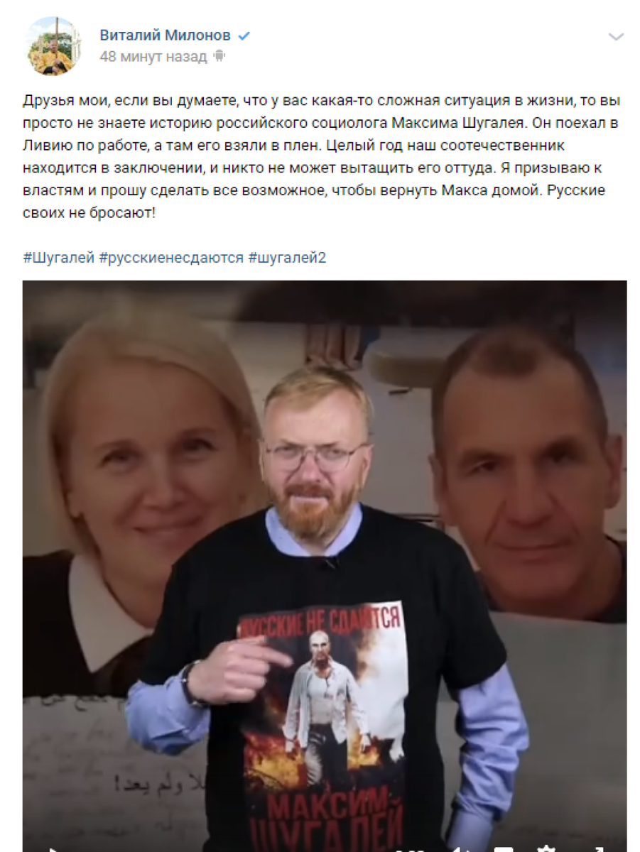 В соцсетях проходит акция в поддержку Максима Шугалея и Самера Суэйфана, которые уже второй год находятся в ливийской тюрьме. Их заточили туда боевики ПНС Ливии, не предъявив никаких обвинений. Их пытают, над ними издеваются, но россияне держатся стойко и не теряют присутствия духа. Накануне премьеры фильма «Шугалей-2», которая состоится 6 сентября на НТВ, в интернете начался флешмоб в поддержку россиян. В акции принял участие и депутат ГД Виталий Милонов. Он призвал власти обратить внимание на ситуацию и вернуть российских ученых, взятых в плен в Ливии, домой. Депутат ГД надел футболку с изображением Максима Шугалея и надписью «Русские не сдаются». Напомним, что фильм «Шугалей-2», выхода которого с нетерпением ждут многие неравнодушные люди, снят на основе реальных событий. Он рассказывает о судьбе россиян, попавших в ливийский плен. Сиквел является продолжением боевика «Шугалей», премьера которого состоялась в мае 2020 года. Кинокартины сняты в поддержку социологов и должны способ