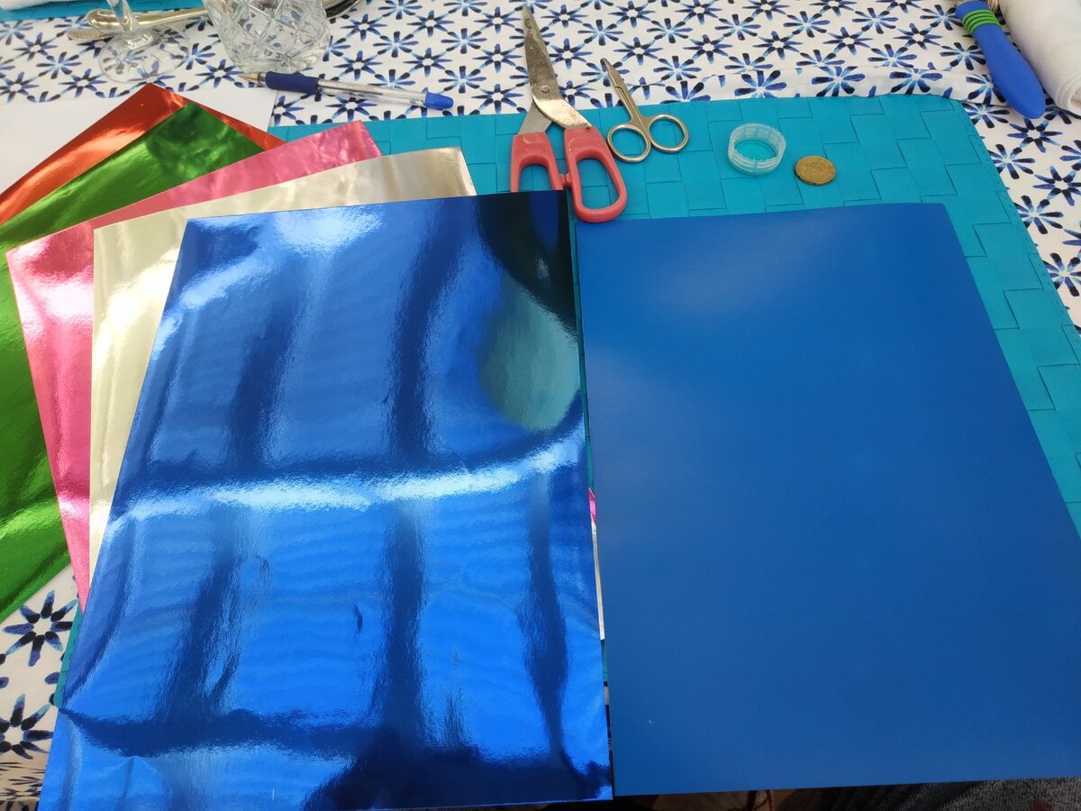 Приготовила цветной картон. Наша с Митей рыбка будет синей. Также приготовила цветную бумагу металлик синего, серебристого и розового цвета. Из нее вырежу чешуйки.