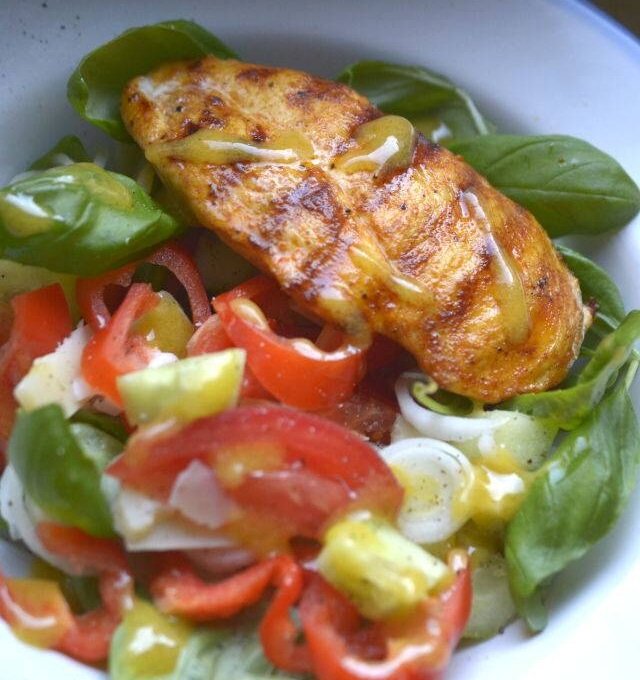 Легкий куриный салат - отличное предложение для вкусного и низкокалорийного ужина. Рекомендую подавать с еще теплой куриной грудкой, тогда будет вкусно. Лучше всего жарить мясо для салата, чтобы оно оставалось сочным и мягким. Я рекомендую посмотреть рецепт, в котором я рассказываю, как приготовить идеальную грудку: Куриная грудка на гриле . Если у вас нет сковороды для гриля или электрического гриля, вы можете разрезать мясо на кусочки и обжарить на обычной сковороде. Я добавила в салат немного сыра пармезан, чтобы приправить его. Однако, если вам нужно следить за своими калориями, я советую вам пропустить это. Приятного аппетита! Количество порций: 2. Время приготовления: 25 минут. ИНГРЕДИЕНТЫ РЕЦЕПТ БЛЮДА 1. Очистите куриную грудку и разделите ее на два равных филе. Перелейте в более глубокую емкость, добавьте ингредиенты для маринада и тщательно перемешайте, чтобы покрыть курицу. Оставьте на 10 минут. 2. Помидор разрезать на четвертинки. Очистите огурец и нарежьте кубиками, а