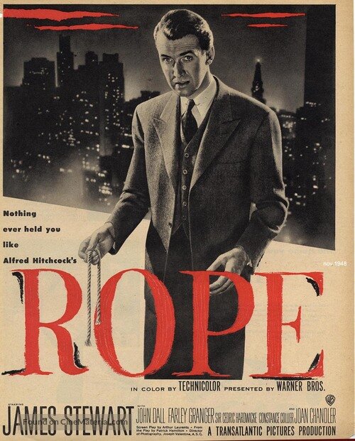 «Верёвка», снятая в далеком 1948 году, стала первым цветным фильм Хичкока. За основу сюжета был взят реальный случай, произошедший в 1924 году, когда два студента Чикагского университета убили 14-летнего подростка, который позже стал частью пьесы Пэтрика Хэмилтона. Для Хичкока фильм «Верёвка» изначально был больше экспериментом. Он хотел непросто перенести пьесу на киноэкран, а снять картину одним долгим планом. Но, к сожалению, одним планом не получилось, так как технические возможности в те времена не позволяли использовать плёнку больше 10 минут. Хичкоку пришлось применить монтаж, но, чтобы картина всё же выглядела как цельное плотно, он при помощи технических уловок скрыл эти монтажные переходы.