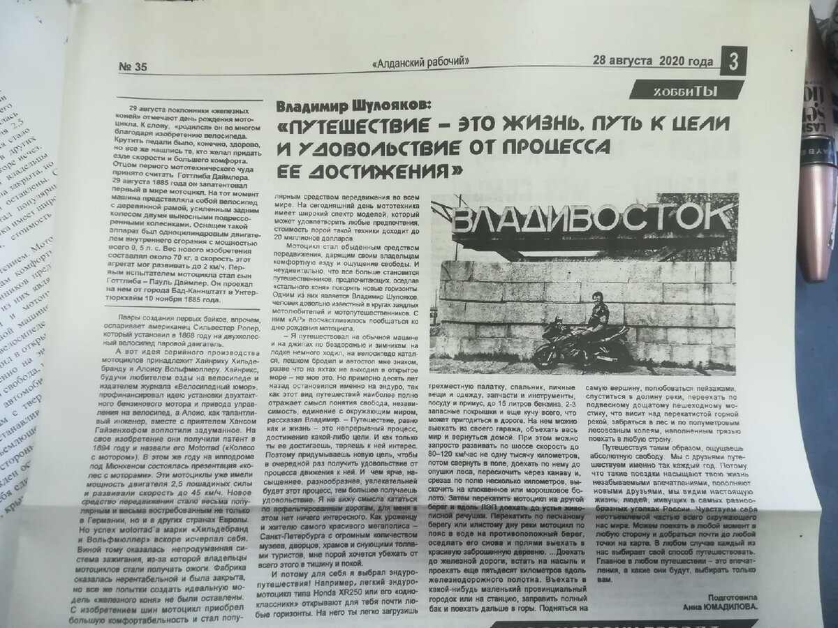 По телеку меня показывали, в журналах разных я неоднократно печатался, теперь вот дошло дело и до газеты. В журнале то любой дурак напечататься может, а ты в газете попробуй, настоящей, чёрно-белой, свинцовой. И ведь это вам не какая-нибудь там Ленинградская вечёрка или Московский комсомолец, а самый настоящий Алданский рабочий. В этот раз я в Якутию не заезжал, но меня и там разыскали и напечатали. Анечка, спасибо тебе огромное за твой труд и твою любовь, прости, что не нашёл времени выразить свои мысли лично, но статья получилась классная, мне очень понравилось, правда.