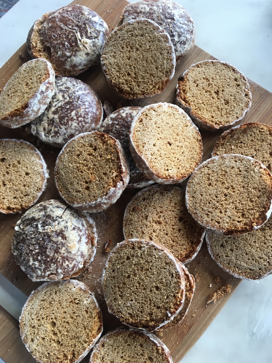 Для приготовления понадобится: Покупаем пряники любые , количество зависит от размера торта. Я делаю очень большой на компанию из 20 человек. Пропорции напишу для среднего тортика на 6-8 порций. Пряники 300 гр ( упаковка) у меня были имбирные шоколадные Сметана 340 гр ( банка) условно +- жирность в среднем 15 % банан 1-2 Ананас консервированный маленькая банка. Грецкие орехи обжаренные. Сгущеное молоко банка 1/2 сливочное масло 100 гр кислый джем Для украшение ваша фантазия. Я украсила, то что нашлось в закромах. Безе двух видов, мини печенье, ягоды Для Украшения бортиков расплавленная карамель. Для начала разрезать пряники на две части. Порезать ананасы и банан. Дно подноса застелить пищевой пленкой и на неё выложить слой пряников. Смазать сметаной, на сметану положить бананы и ананасы, присыпать орехами Слои повторять чередуя пока не закончатся пряники. Получается вот такая основа торта. Её надо завернуть в пищевую пленку и убрать в холодильник для пропитки минимум на 12
