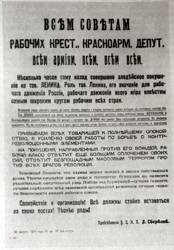 На покушения, направленные против его вождей, рабочий класс ответит еще большим сплочением своих сил, ответит беспощадным массовым террором против всех врагов Революции.