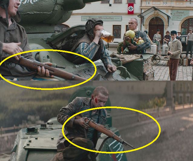 1. "Т-34" Наши военнопленные угнали танк с полигона и теперь "катаются" по территории Германии. Проезжая через один из городов, мужики решили сделать остановку, чтобы пополнить продуктовый запас. Не обошлось без импровизации - угостились пивом в местном пабе. На центральной площади, они обезоружили одного единственного солдата. А теперь посмотрите на внешний вид винтовки этого солдата. Через несколько часов, винтовка уже совсем не та, которую изначально конфисковали. 2. Фильм Сила есть, ума не нужно... приходят на ум слова, когда смотришь на кадры ниже. Знаете сколько весит морская мина? Я не знаю как называется та модель, которую тягали по очереди Бероев с Дроздом, но точно не менее 150 кг. Очень сомневаюсь, что мужики смогли бы перетянуть столько мин. 3. Фильм Один из первых кадров сериала "По законам военного времени". Пожалуй, оставлю вам возможность поупражняться во внимательности. Дам только небольшую вводную - на дворе 1941-й год... Ну а с вас - комментарий после прочтения с