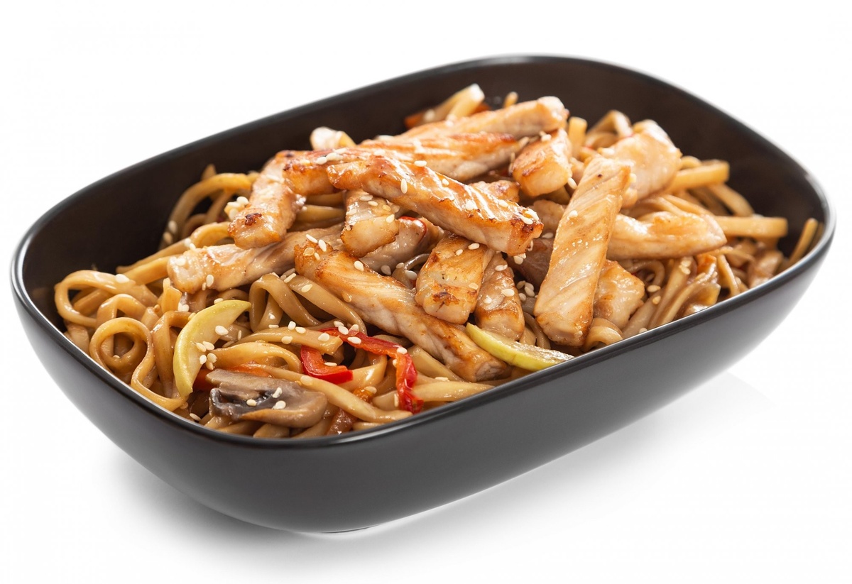 ~ 82 рублей. Лук и морковь порезать ломтиком. В сковороде разогреть половину масла и обжарить овощи минут 5. Этим временем порезать перец шашками. Сельдерей ломтиком, а чеснок и имбирь потереть на мелкой терке. Добавить все к моркови и луку. Обжарить еще пару минут, затем добавить соевый соус и воду.Тушить почти до полной готовности овощей. Куриное филе порезать достаточно крупными кусками. Обжарить в оставшемся масле буквально минуту, чтобы внутри филе было еще сырым. Добавляем к соусу с овощами, отставляем в сторону. Лапшу удон отварить в кипящей подсоленной воде минут 6-8. Слейте воду. Добавьте лапшу к мясу и овощам и потушите минут 5-7. Поперчите по вкус и, если необходимо, посолите. Подавайте сразу же. Рецепт "Лапша удон с курицей и овощами" готов, приятного аппетита !