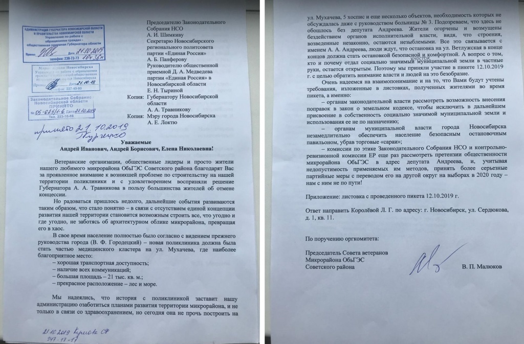 Спор, связанный со строительством поликлиники на ОбьГЭСе, не утихает. Общественники не удовлетворены работой депутата Заксобрания Алексея Андреева и требуют его перевода на другой округ. С таким обращением они обратились к спикеру Заксобрания Андрею Шимкиву и руководителю общественной приемной Дмитрия Медведева. Напомним, вопрос строительства поликлиники на ОбьГЭСе явялется одним из самых болезненных. Группа активистов выступает за полноценный медцентр по адресу улица Мухачева, 5 – на территории городской больницы №3. Там есть незастроенные 29 тысяч квадратных метров, которые идеально бы подошли, на их взгляд, под взрослое и детское отделения, а также женскую консультацию. Однако, по их словам, депутат Заксобрания Алексей Андреев лоббирует другое место – на улице Энгельса около рынка, к которому он имеет отношение. Поликлинику там собирались строить по концессии, но после активных действий местного населения концессию отменили. Борьба между общественниками и Андреевым разгорелась не