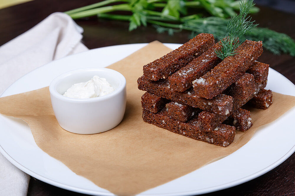 Хотите приготовить вкусную, аппетитную и бюджетную закуску? Обратите внимание на гренки с чесноком из бородинского хлеба. Такое угощение заслуживает внимания каждого человека, поскольку с его приготовлением справится даже начинающая хозяйка. Ингредиенты: · соль – 1 чайная ложка; · бородинский хлеб – 500 граммов; · масло растительное – 3 столовых ложки; · чеснок – 9 зубчиков; · оливковое масло – 1 чайная ложка. Поэтапное приготовление: · у вчерашнего хлеба срежьте корочку, оставив мякиш; · нарежьте мякиш кусочками, толщина которых не менее двух сантиметров, каждый ломтик разрежьте еще на несколько брусочков; · три зубчика чеснока нарежьте тоненькими пластинками (для придания маслу аромата), а оставшийся продукт пропустите через пресс; · соедините в ступке пропущенный через пресс чеснок и соль, толките продукты до тех пор, пока чеснок не пустит сок (он должен стать очень мягким); · в готовую смесь добавьте оливковое масло, хорошо все перемешайте; · разогрейте на сковороде растительное ма