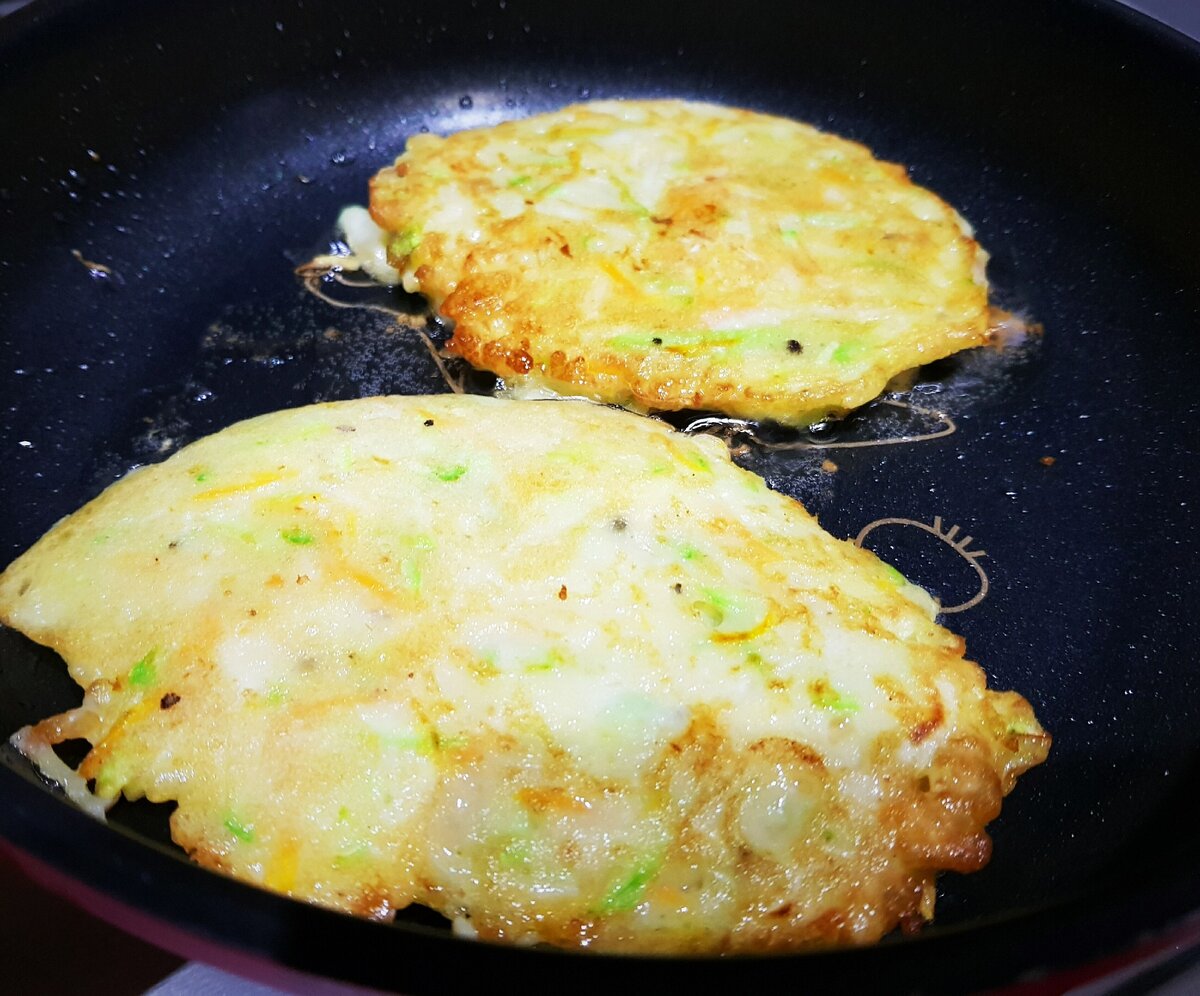 На предварительно разогретой сковороде выложить 1 ст.л. смеси из кабачков и подрумянить с двух сторон.