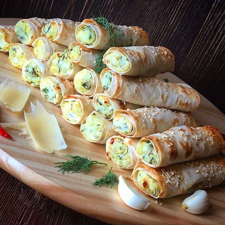 - Выкладываем начинку на край каждого прямоугольника, сворачиваем трубочкой.