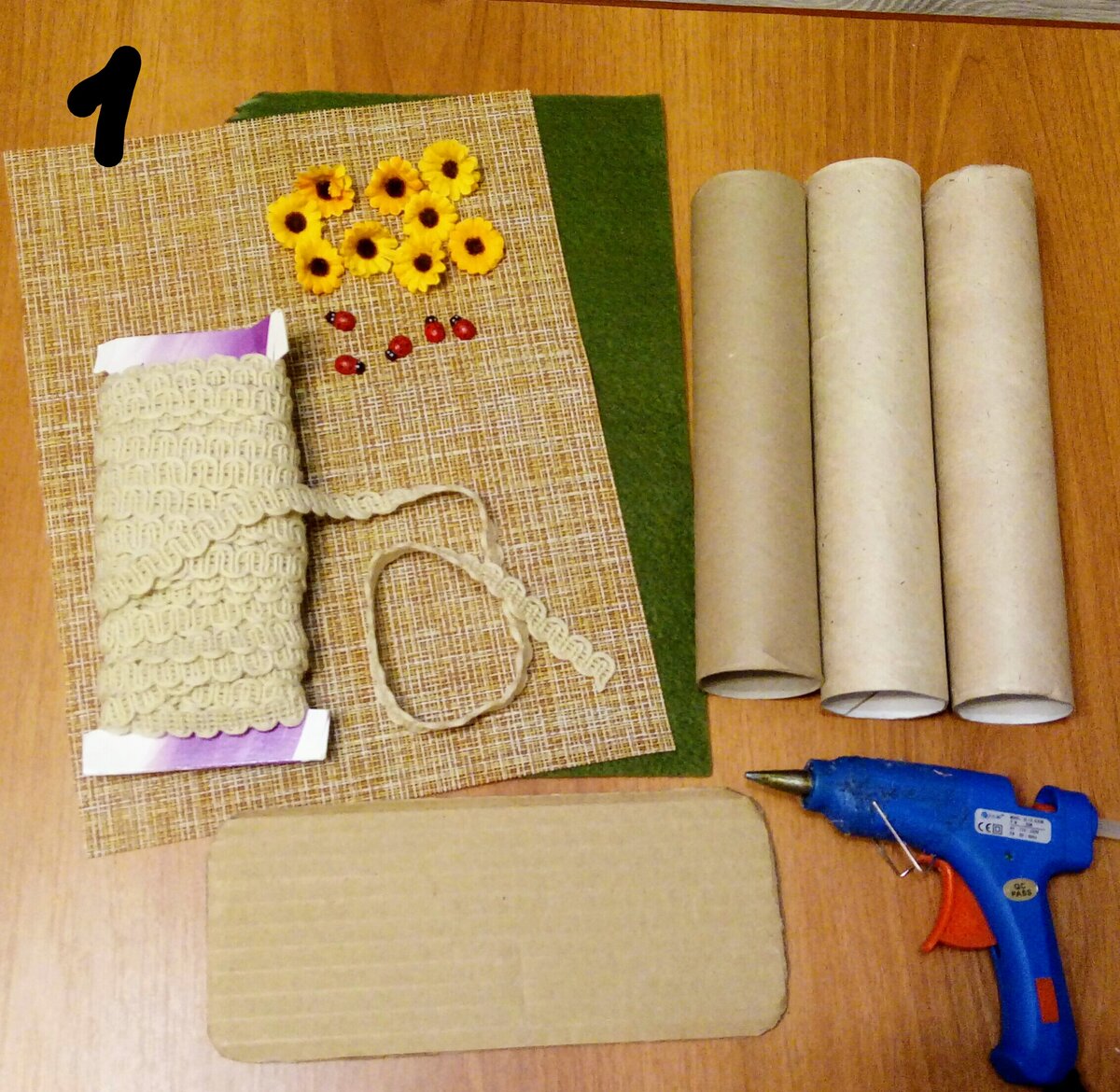 1. Для работы нам понадобятся: втулки от бумажных полотенец, мешковина (у меня салфетка под горячее из ФиксПрайса), тесьма узкая, фетр зеленый, картон плотный, искусственные цветочки, божьи коровки, грибочек, клеевой пистолет.