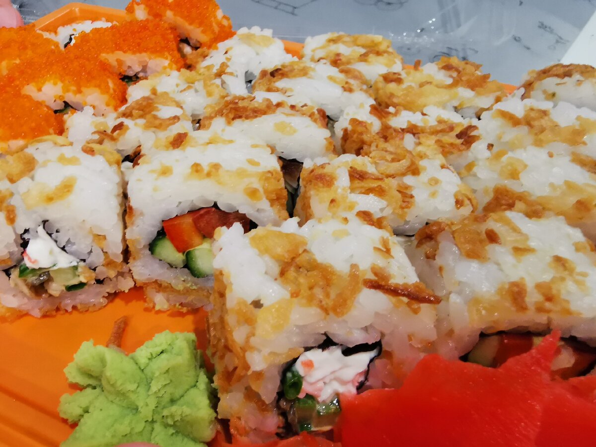 Муж у меня все время в поисках бомбических роллов... Просто мы уже нашли те самые,которые вкусные всегда, неизменно и убедились в этом ни раз. Но он все равно пробует новые😅 Вот и сегодня сделал заказ в my box пока меня не было дома... Упаковка фирменная, все красиво, все здорово... Васаби и имбиря положили мало... Сами роллы аккуратные, одинаковые. Но теперь минусы- это вкус... Я бы сказала, что они съедобные, но не больше, наслаждения не получили.. Сегодня на них была скидка Цена конечно смешная за такое количество, но и удовольствия не было, не смотря на всю красоту упаковки и оформления.... И не говорите, а что вы хотели за такую стоимость, цена со скидкой... Лучше уж 4 порции, но действительно вкусных😉 В общем, не советую 😔😔