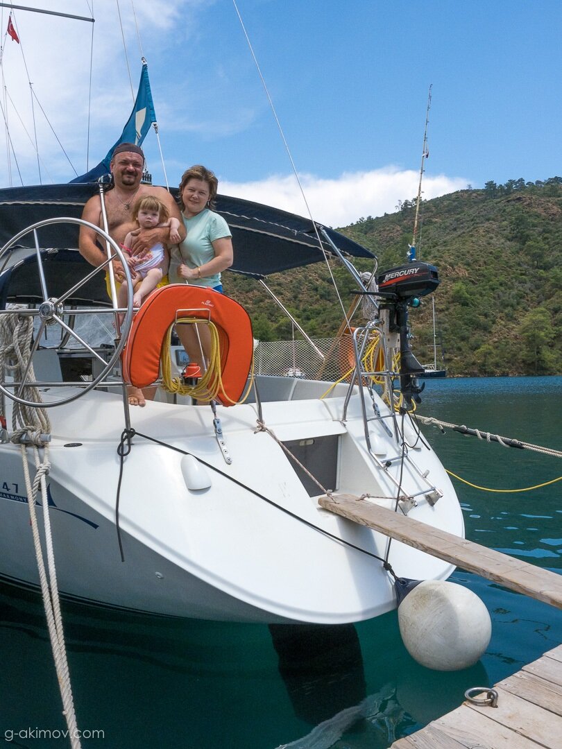 Решили перейти на ночь в бухту Бойнузбюкю-Бэй. Там за ужин в кафешке можно стоять бесплатно у понтона, на котором халявные электричество, вода и вайфай. Намоем лодку пресной.