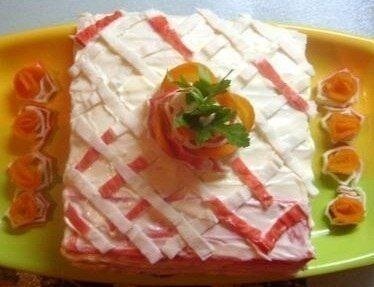 Разворачиваем крабовые палочки, одну оставляем на украшение На каждую развернутую крабовую палочку выкладываем начинку и немного смазываем майонезом,чтобы слои не распадались между собой.И так слой за слоем.