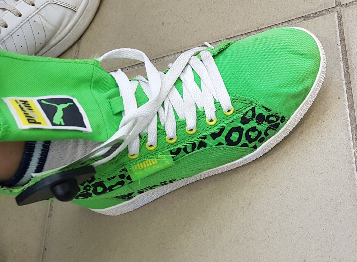Но вчера мы кое-что выбрали на примерку. Дочка интересуется необычными кедами. Эти зеленые Puma на полке мне не понравились.