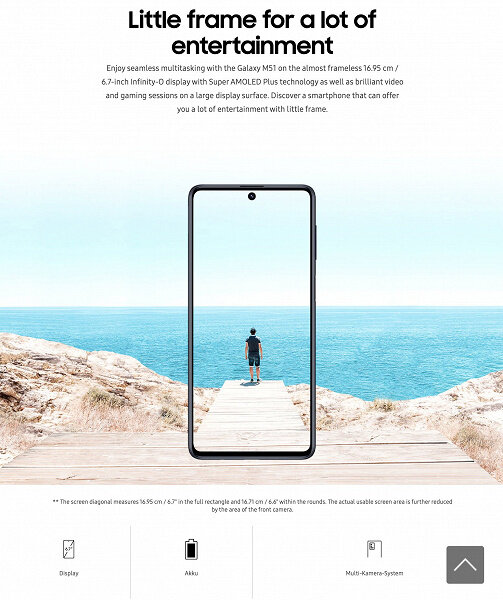 Самым ожидаемым смартфоном Samsung сейчас сложно назвать Galaxy Z Fold2 5G, хотя бы потому, что его цена превысит 2000 долларов, а общий тираж составит (по предыдущим данным) всего 500000 штук. Но гораздо более дешевый Galaxy M51 может стать настоящим хитом. И теперь стало известно, сколько будет стоить эта модель в Европе. 360 евро - столько попросят в Европе за автономного монстра Galaxy M51 на условиях предзаказа. Немецкий ритейлер также подтвердил, что емкость аккумулятора смартфона составляет 7000 мАч, а также мощность зарядки - увы, всего 25 Вт, поэтому для полной зарядки аккумулятора потребуется около 2 часов. Диагональ экрана Super AMOLED составляет 6,7 дюйма, по центру встроена фронтальная камера с 32-мегапиксельным сенсором. Характеристики основной камеры Galaxy M51 хорошо показаны на изображении выше. Есть четыре датчика. Основное разрешение в 64 Мп дополнено сенсорами с разрешением 12, 5 и 5 Мп. Мобильный телефон также получил 6 ГБ ОЗУ и 128 ГБ памяти, а аппаратная платф