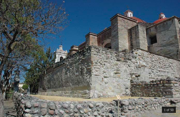 К первой (не по хронологии, а по расстоянию от современного входа на памятник) группе строений примыкает католический храм, который выстроен на руинах и с использованием материала сооружений доколумбовой эпохи.