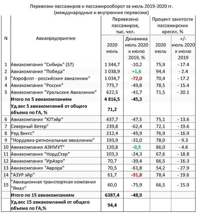 Основные производственные показатели гражданской авиации за январь-июль 2020