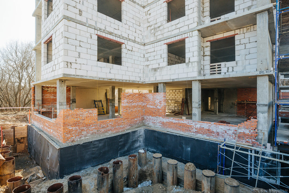 2. То есть с улицы да, здание выглядит как монолит. Я и сам, когда охранник пошел искать нам каски, с тоской посмотрел на здание, мол очередную скукоту снимаю. Это новый жилой комплекс на Краснобогатырской улице.