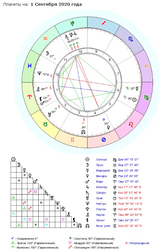 День будет активным и трудоёмким. Меркурий вновь поставит и позволит решить множество сложных задач. Обострит ум и творческие способности. Венера снова в двух оппозициях с Сатурном и с Плутоном. Они приносят душевные муки. Лилит сразу в трёх квадратах, что не обещает ничего хорошего. В этот день у нас: три оппозиции, три тригона, шесть секстилей, три квинконса, четыре квадрата.