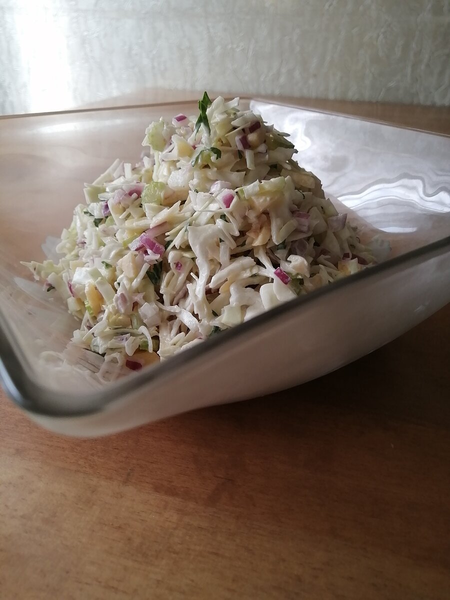 Взяла: 1/4 кочана молодой белокочанной капусты, 1 стебель сельдерея, 1/2 яблока, 1/2 красной луковицы, 1 веточку петрушки, 2 ст. л. майонеза, 2 ст. ложки сметаны,