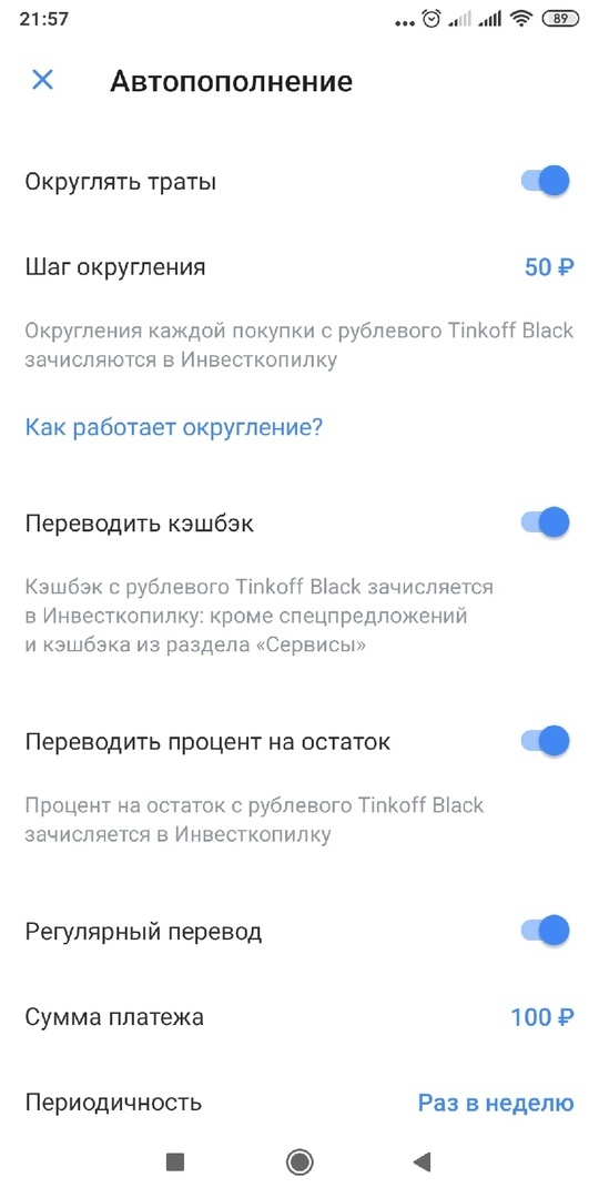 Всем привет!!! 24 июля в личном кабинете Тинькофф заметил новую функцию - инвесткопилка. Меня конечно же она сразу заинтересовала и я решил попробовать что к чему. Для работы с инвесткопилкой необходимо открыть ее. Выбрать в какой валюте будем копить (рубли, доллары или евро). И пока имеются деньги в копилке, они инвестируются в фонды Тинькофф Капитала, ну а если активы дорожают, мы получаем прибыль. Фонды вкладывают деньги в золото, акции и облигации в равных долях. Такой баланс нужен для надежности: помогает показывать стабильный результат. Есть несколько вариантов пополнения: Денег можно вкладывать сколько угодно, даже самого малого. И разобравшись как она работает я настроил все виды пополнения (вручную не пополнял). Мои пополнения конвертируются в рубли. В итоге у меня получилось за 5 недель заработать чуть больше 2800 рублей. Думаю не плохой результат для меня. И сегодня я закрыл копилку (при закрытии удерживается 1 рубль за обслуживание и налог на прибыль 13%) и закинул на бр