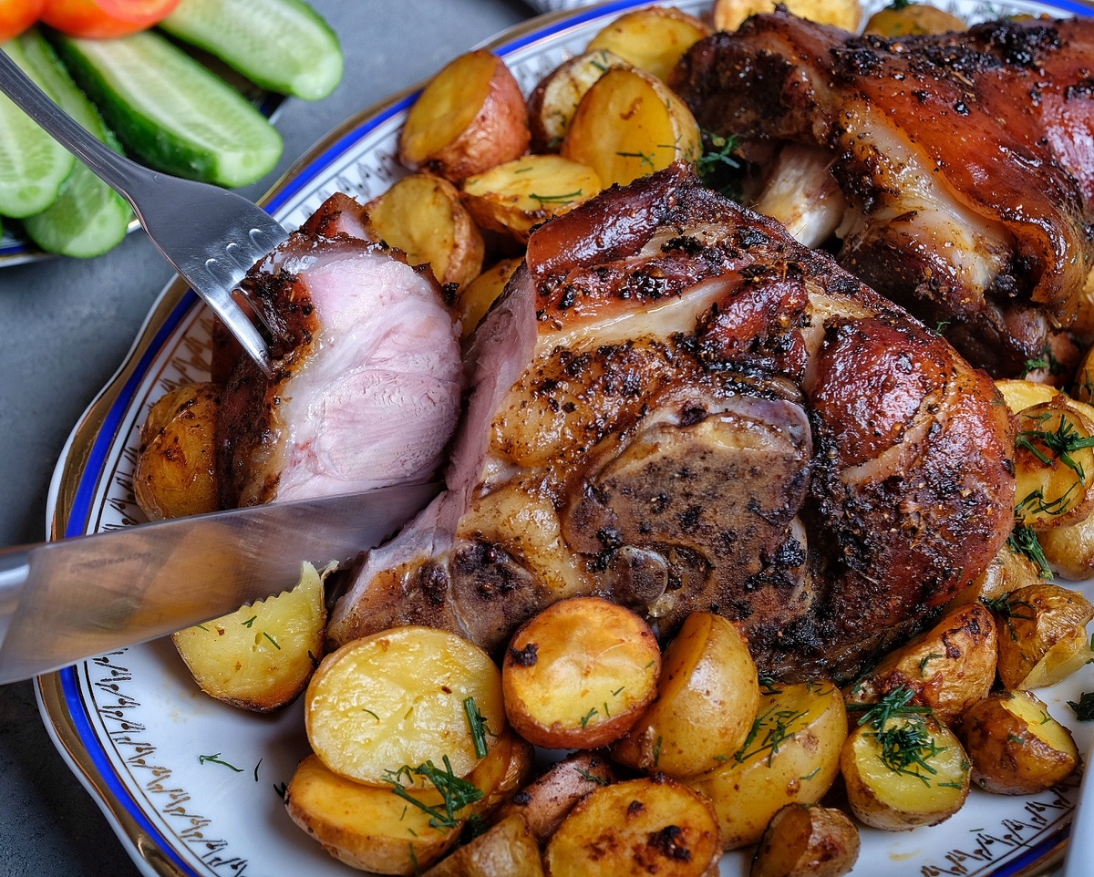 Мне кажется, что это отличная репетиция вкусного новогоднего ужина. Готовим свиную рульку с запечённым картофелем. Можно разделить на два этапа: вечером приготовить рульку, а на следующий день - запечь ее с картофелем. Ингредиенты: Свиная рулька - 1 штука (около 1,5–2 кг) Картофель - 800 г Лук репчатый - 1 штука Морковь - 1 штука Чеснок - 2–3 зубчика Лавровый лист - 2–3 штуки Гвоздика - 2–3 штуки Мед - 2 ст.л. Соль, перец, специи - по вкусу Растительное масло Готовим: Рульку тщательно промыть и обсушить бумажными полотенцами. В большую кастрюлю положить рульку, залить водой так, чтобы она покрывала мясо. Довести до кипения, снять пену. Добавить лук, морковь, чеснок, лавровый лист, гвоздику, соль и перец по вкусу. Варить на медленном огне 2–3 часа, до готовности мяса. Разогреть духовку до 180 градусов. Картофель помыть, при желании очистить, нарезать крупными кусочками, посолить, добавить любимые специи, сбрызнуть растительным маслом. Выложить на противень, картофель запечь до золот