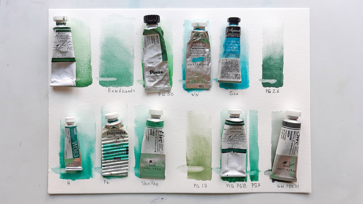Кобальт зелёный, как и Оксид хрома помогают расширить палитру зелёных красок и создавать заливки, склонные к грануляции. Обычно кобальтовые краски выпускаются в линейках профессиональной акварели.