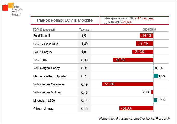 По данным Russian Automotive Market Research, в январе-июле 2020 г. продажи новых легких коммерческих автомобилей* в Москве составили 7,47 тыс. ед. Это на 21,6% ниже результата аналогичного периода 2019 г. Отметим, что сокращение продаж новых LCV в столице зафиксировано на протяжении всех семи месяцев 2020 г.