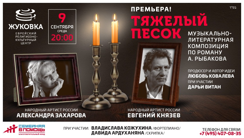 9 сентября на сцену Еврейского религиозно-культурного центра «Жуковка» выйдут Народная артистка РФ, ведущая актриса Московского театра «Ленком Марка Захарова», Александра Захарова и Народный артист РФ, ведущий актер Театра им.Евгения Вахтангова, Евгений Князев. Музыкальное сопровождение - Владислав Кожухин (фортепиано) и Давид Ардуханян (скрипка). Билеты на спектакль можно приобрести вот тут.