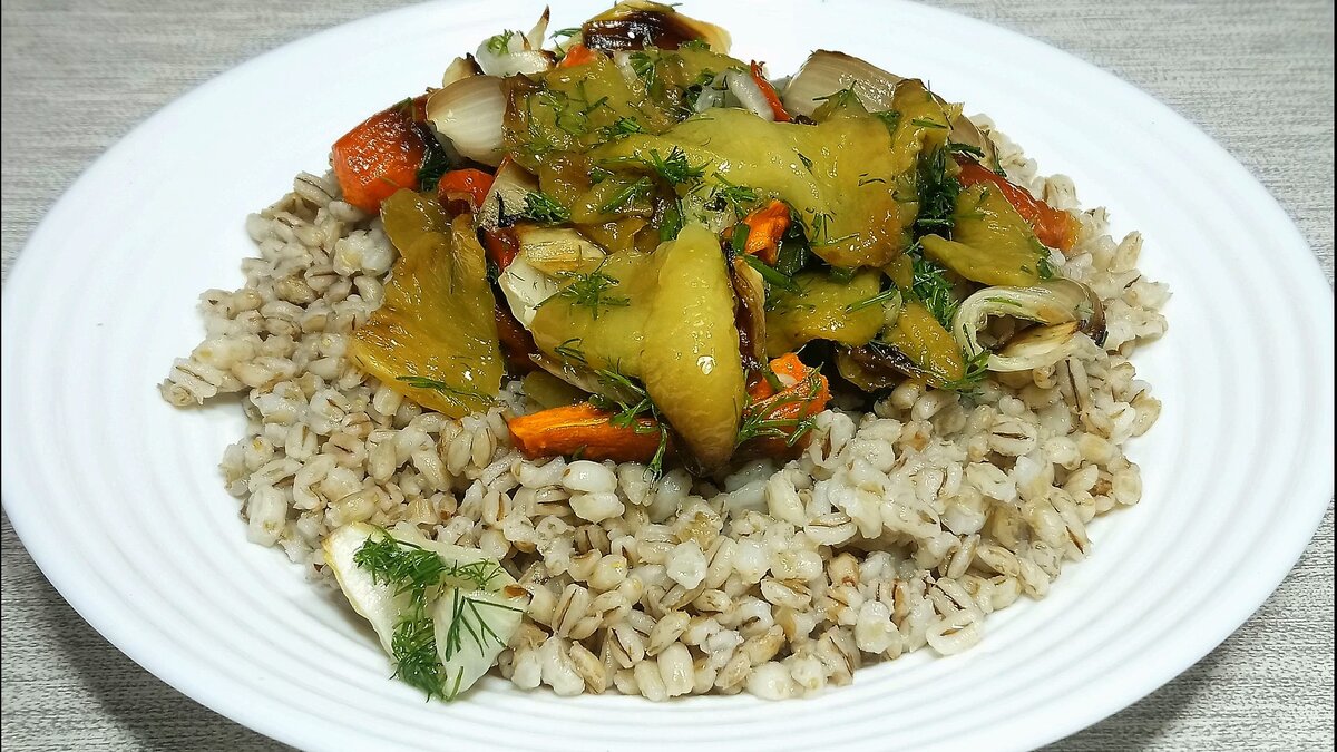 Гарнир из перловки с печеными овощами отлично походит к мясу, рыбе, дичи. И как самостоятельное вегетарианское блюдо.