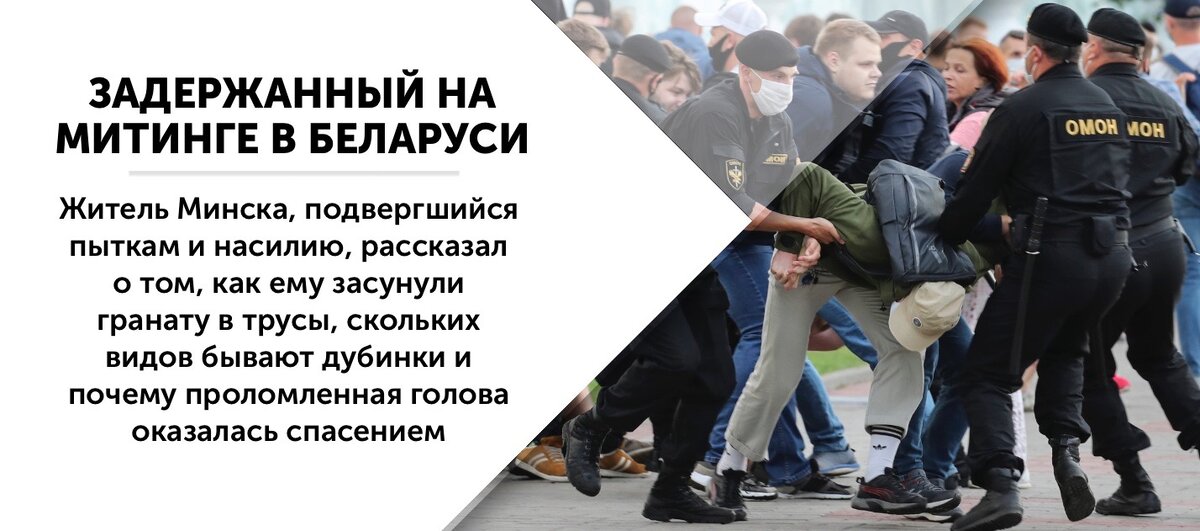 Есть две дубинки: резиновые и дубинки с металлическим стержнем внутри, их выдают офицерам, якобы они более аккуратно ими пользуются и не навредят. Я лежал в этом автобусе, выполнял все, что мне говорили, я не двигался. Я понимал, что когда пи**ят, то это не то место, где ты можешь поднять голову и сказать «я протестую», тебя просто там на**й убьют. Я лежал тихо, в куче этих людей, он подошел ко мне, этот чувак с особенной дубинкой, поставил на меня ногу и начал по голове х**рить этой палкой с металлическим стержнем. И после первых ударов, знаете, начинает звенеть в ушах, и ты уже особо не чувствуешь, у тебя уже вакуум. После каких-то ударов он, видимо, рассек мне голову, но я уже этого не чувствовал, я даже этого не понял сразу. Потом он просто ушел, а я оказался где-то под людьми. Ты лежишь и, с одной стороны задыхаешься, а с другой чувствуешь, как пи**ят людей сверху. Вот и думаешь: непонятно, где лучше — задыхаться снизу или быть сверху, где тебя пи**ят.