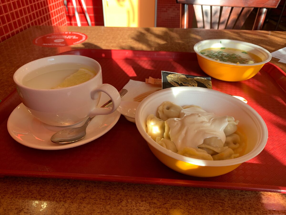 На этот раз я заказала "Разнообразный обед", состоящий из горохового супа с копченостями, пельменей со сметаной и черного чая.