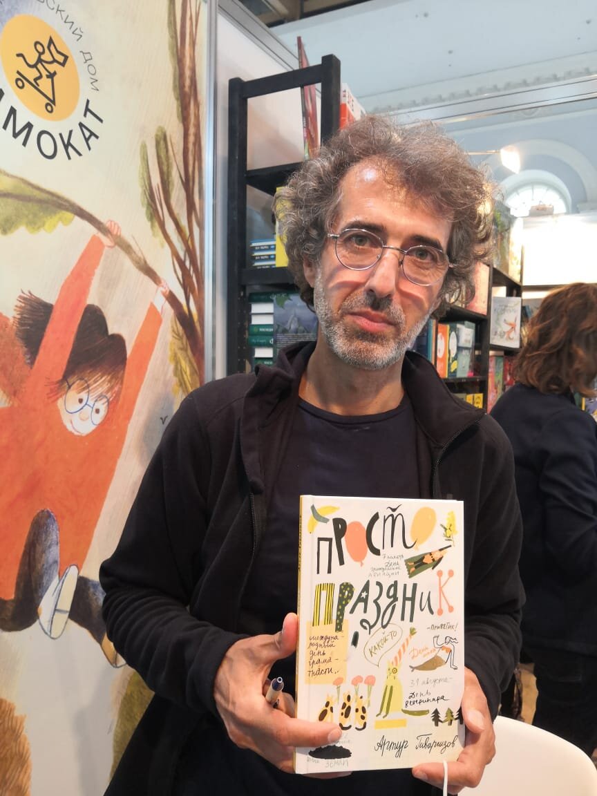 Это он в выходные был в домике Самоката! Читал стихи из новой книжки - просто праздник! В смысле, для нас всегда Артур - праздник, да ведь и новая книжка так называется - "Просто праздник!" Каждый день там превращается в праздник - это такой