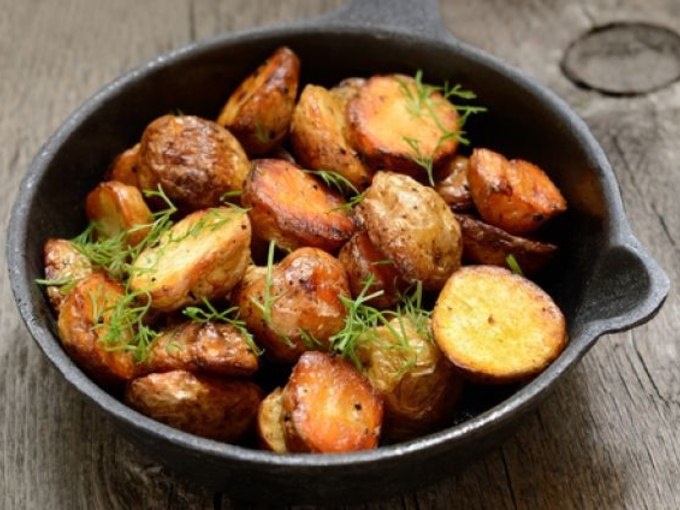 Запеченный картофель с розмарином Ингредиенты Масло оливковое - 1/8 стакана Черный молотый перец - 1/2 ч.л. Картофель - 1 кг Розмарин Соль Перец Способ приготовления Чтобы приготовить ароматное и пряное блюдо по этому рецепту, вымойте, но не чистите картофель. Вытрите его насухо бумажным полотенцем, порежьте на 4 части. Обмажьте четвертинки картофеля оливковым маслом и сложите в глубокую посуду, чтобы они не касались друг друга, обсыпьте розмарином. Запекайте в заранее разогретой до 190° С примерно полчаса, затем выньте из духовки, посыпьте крупной солью и запекайте еще 20-25 минут до золотистой корочки.