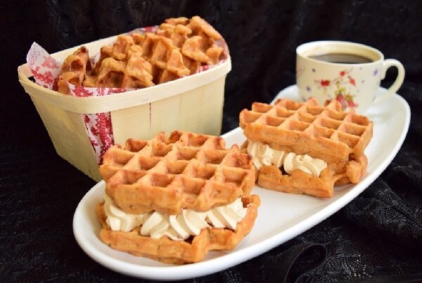 Подавайте вафли с кремом к чашке кофе. Они очень вкусные, имеют приятный аромат от сочетания яблок с корицей и бананов.