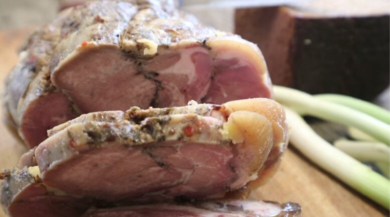 Прелесть этого рецепта в том, что мясо варится не в бульоне, а в пленке. То есть все соки не вывариваются в кастрюлю, а остаются внутри, делая его невероятно нежным. Многих беспокоит процесс приготовления в пластике. Отвечу. Пищевая пленка и рукав для запекания разработаны так, чтобы не вступать в реакцию с жидкостями, агрессивными средами (например, с пищевой кислотой) и не разлагаться при нагревании. Обычный целлофановый пакет для рецепта не подойдет. А рукав для запекания и пищевая пленка безопасны. Мясо по этому рецепту станет идеальной заменой колбасе, а также отличной холодной закуской. Рулет после остывания режется тонкими, безумно аппетитными ломтиками. ульку необходимо промыть, шкуру почистить. Грубые и темные места шкуры лучше срезать. По вкусу можно убрать часть жира или оставить весь на месте. С одной стороны сделать разрез вдоль всей рульки до кости. Аккуратно вытащить кость. Подготовленное мясо положить на пищевую пленку. Завернуть в плотный рулет. Пленкой щедро обмотать