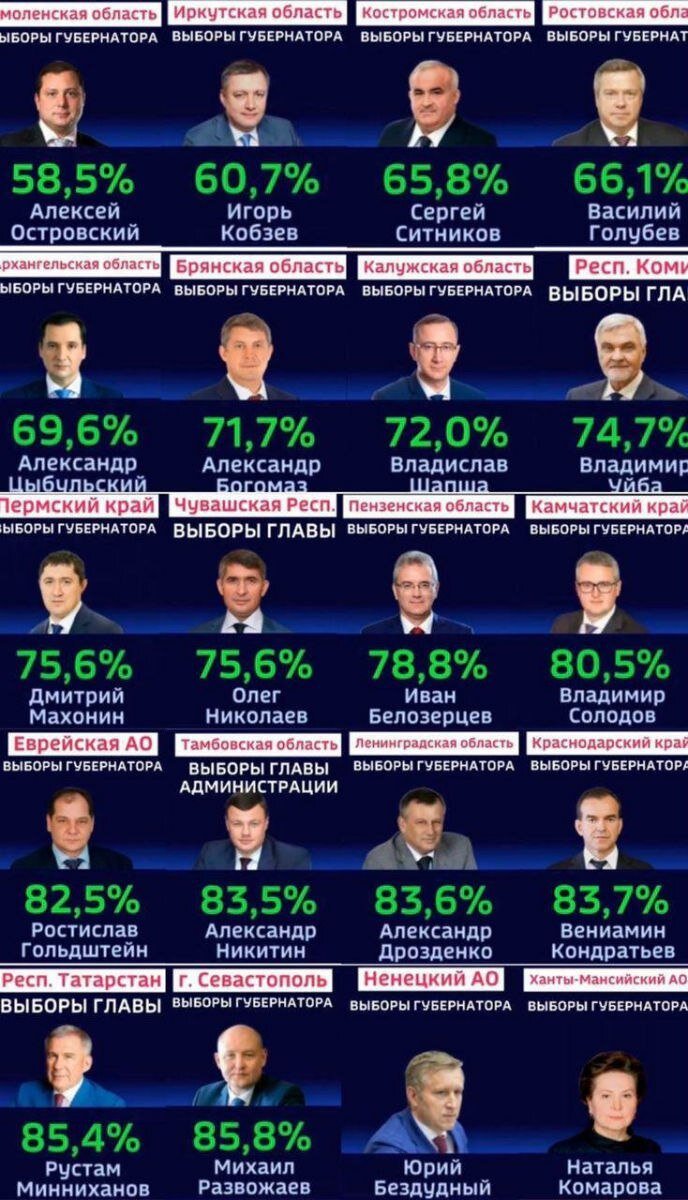 Кремлевские кандидаты, которые претендовали на губернаторский пост, выиграли за явным преимуществом. Они набрали от 65 до 90%. Губарнатор Севастополя Развожаев набрал 85,8%. Наверное это самый популярный политик в России на данный момент. При этом нельзя говорить, что