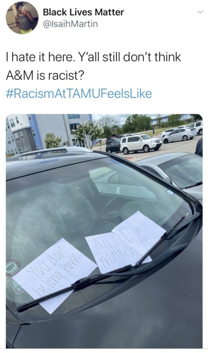 Чернокожий студент из Техасского университета A & M заявил в полицию из-за того, что на его машине кто-то оставил расистские записки «все жизни важны», «убирайся», «ниггер», которые его напугали. Полицейские посмотрели записи с ближайшей камеры и увидели, что обиженка положил себе эти записки сам.