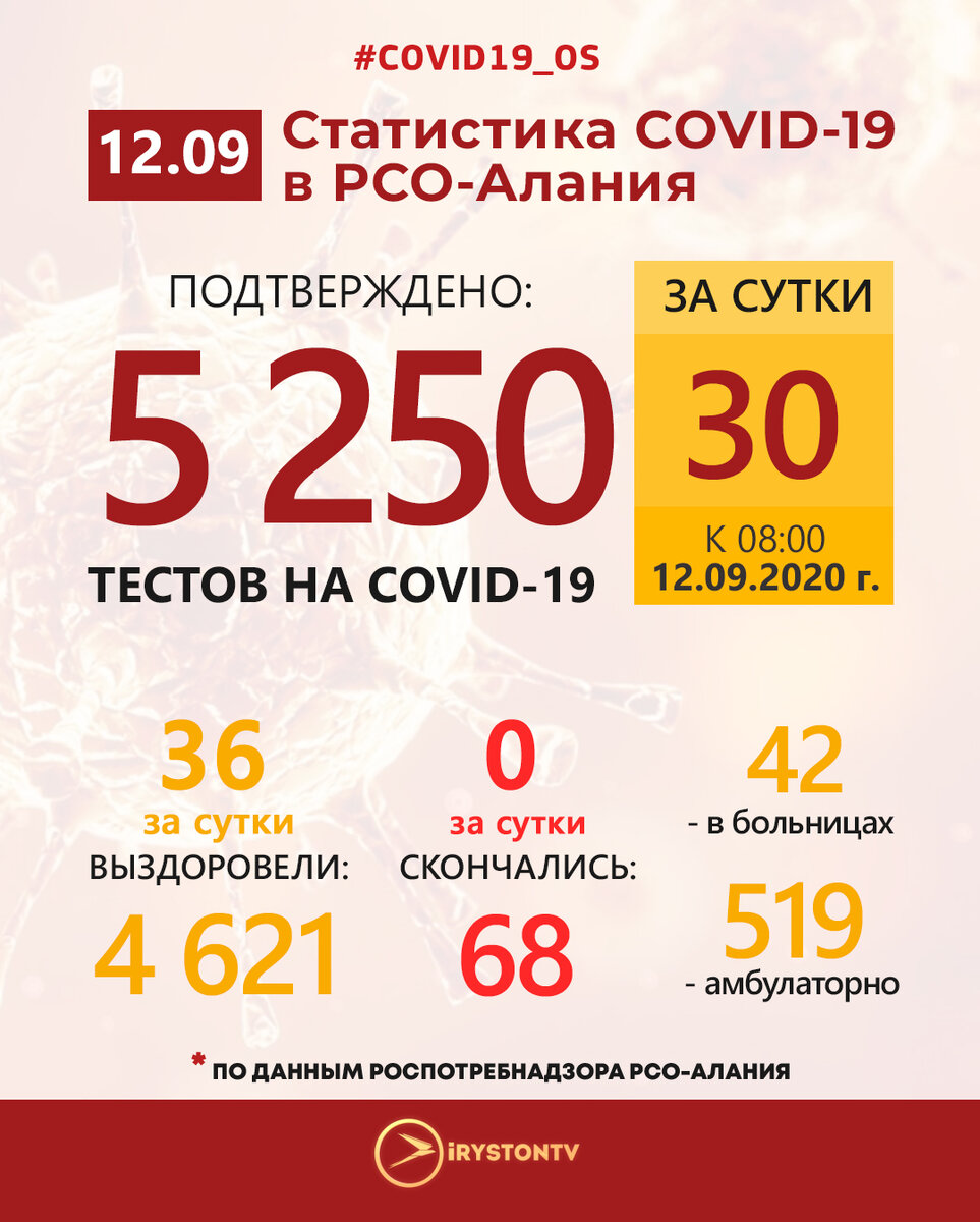 По данным Роспотребнадзора РСО-Алания на 08:00 12 сентября 2020 года в Республике Северная Осетия-Алания зарегистрировано 5 250 (+ 30 за сутки) случаев заражения новой коронавирусной инфекцией.