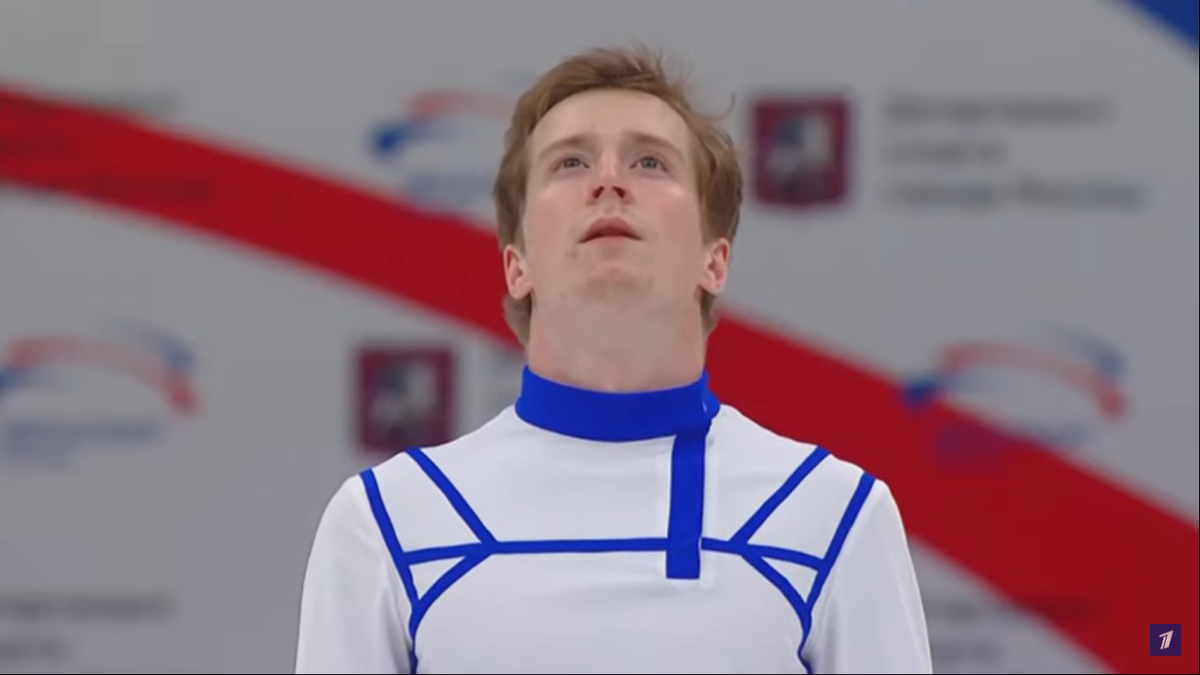 Внезапная программа с не менее внезапным костюмом. Ну я понимаю, косоворотка типа, русско-народный костюм, но для чего эти странные синие полоски вразнобой - они как-то режут глаз и отвлекают. Программа, как ни странно, Саше подходит - ему идет такой образ богатыря, за родину, в атаку и всё такое. Такой Алеша Попович из мультика. Хорошо смотрелся, неплохо прыгал, пытался пару раз навернуться, но сдюжил.